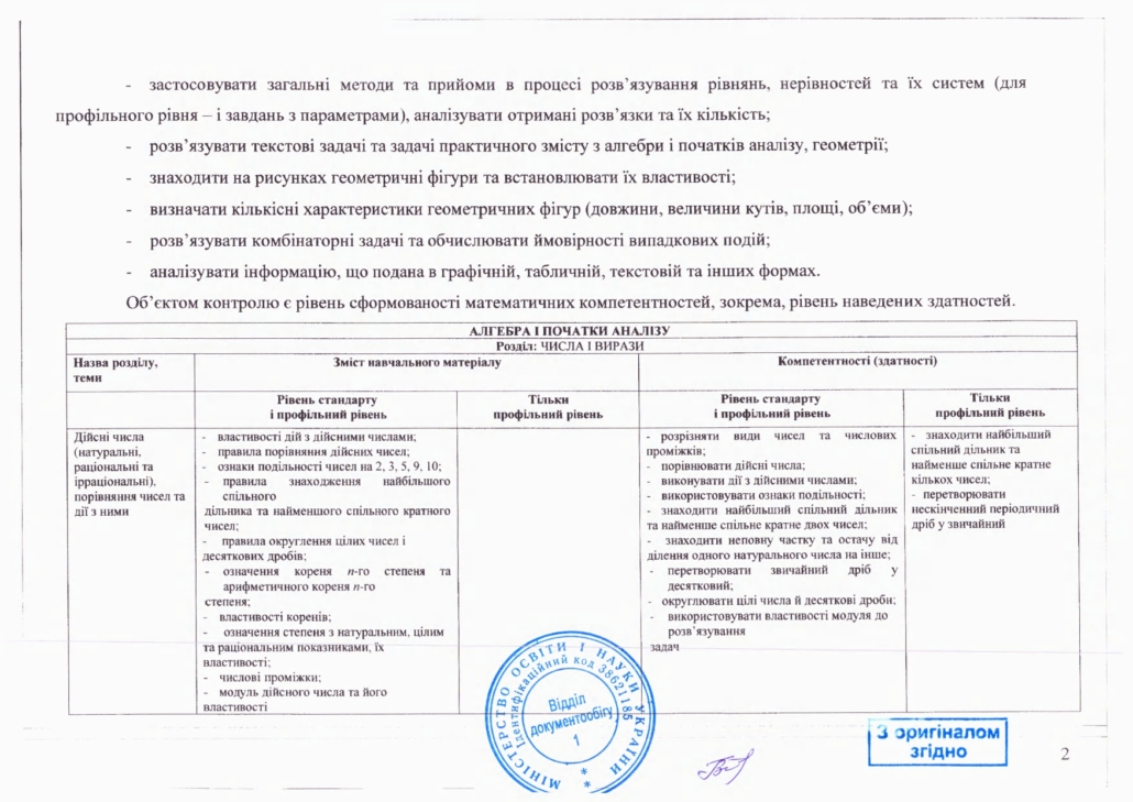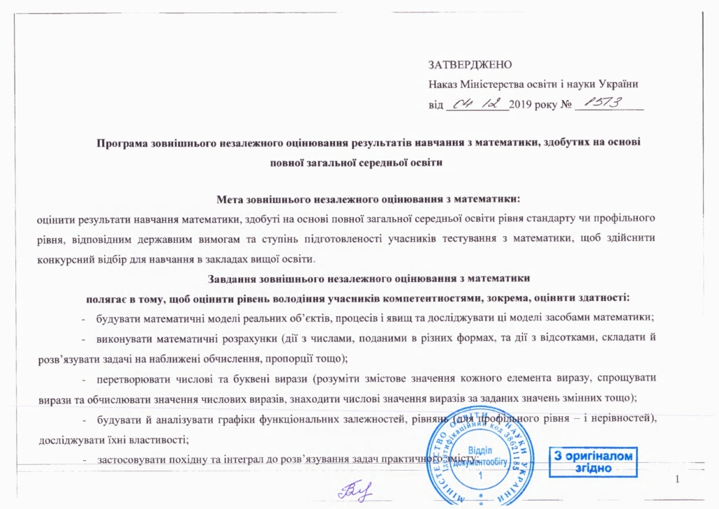 Програма зовнішнього незалежного оцінювання з математики містить вимоги до рівня загальноосвітньої підготовки учасників з цього навчального предмета, а також конкретизує, що повинен знати та вміти випускник навчального закладу в межах визначених тематичних розділів.